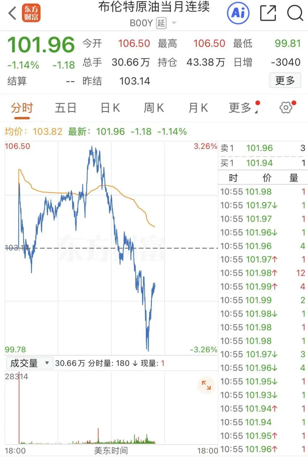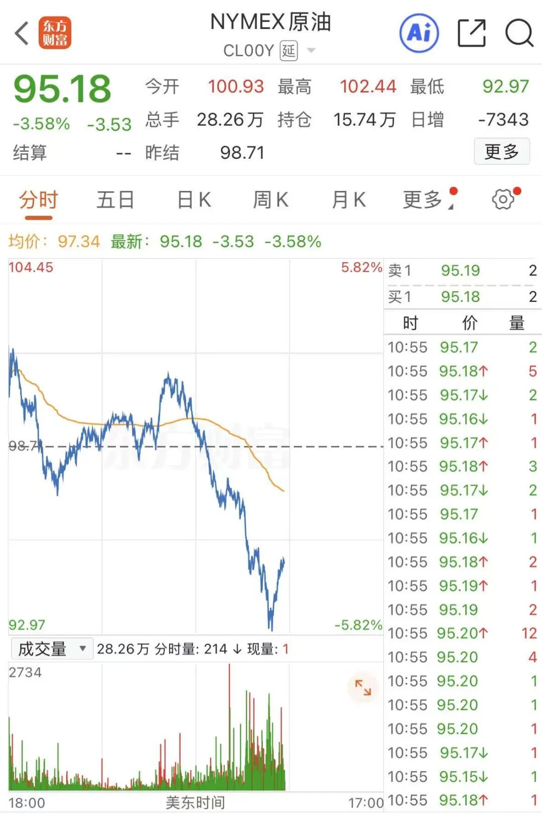 16日晚间,国际原油大跌,WTI原油一度下挫逾5%,布伦特原油一度跌超3%,失守100美元/桶。截至发稿,原油价格有所回升,WTI原油下跌3.58%,报95.18美元/桶,布伦特原油跌1.14%,报101.96美元/桶。